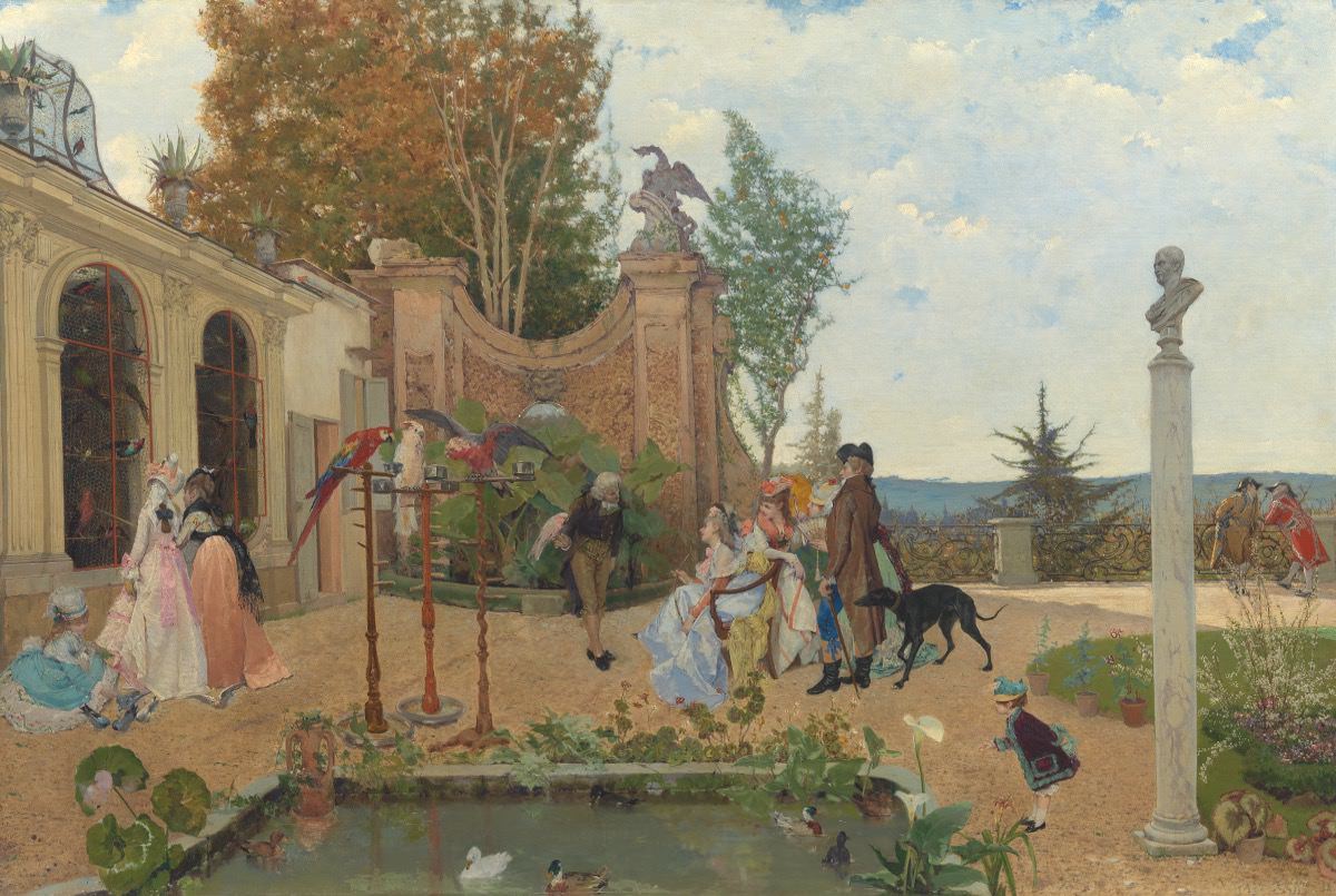 This exotic 19thc. scene is set in Rome in the private gardens of the Villa Borghese, the famous public park, residence and museum which was the creation of Cardinal Scipione Borghese in the 17thc. Created as an idealized Renaissance version of an ancient Roman villa, it contained museums for the Borghese collection of ancient Roman sculpture and old master paintings, residences and public and private gardens. Much of the ancient Roman sculpture was sold to Napoleon under duress and transported to Paris in a long and arduous horse and cart journey over the Alps, as Maritime routes to France were blocked due to war.