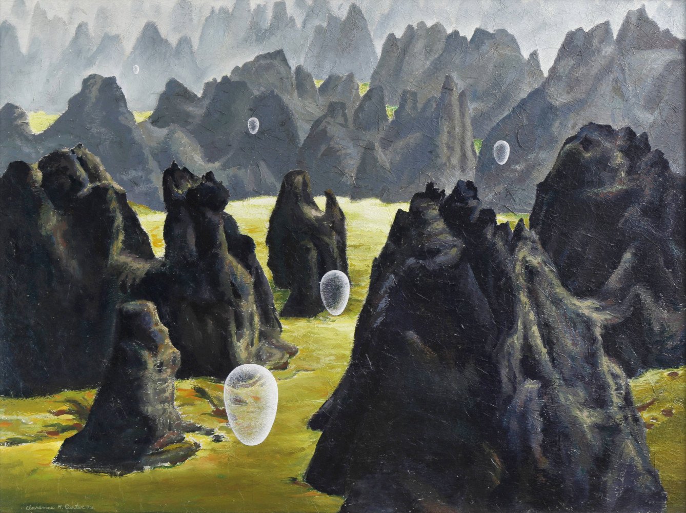 Death and the unknown beyond are obvious preoccupations for Carter. His ghostly 1927 painting The Lady of Shallot is the first of his paintings to take death and transience as its subject matter. Based on Tennyson’s poem, the cursed Arthurian maiden Elaine of Astolat is pictured, dying for her love of Sir Lancelot—her figure cast with the same strange luminesence that would define the orbs seen in Carter’s later works.