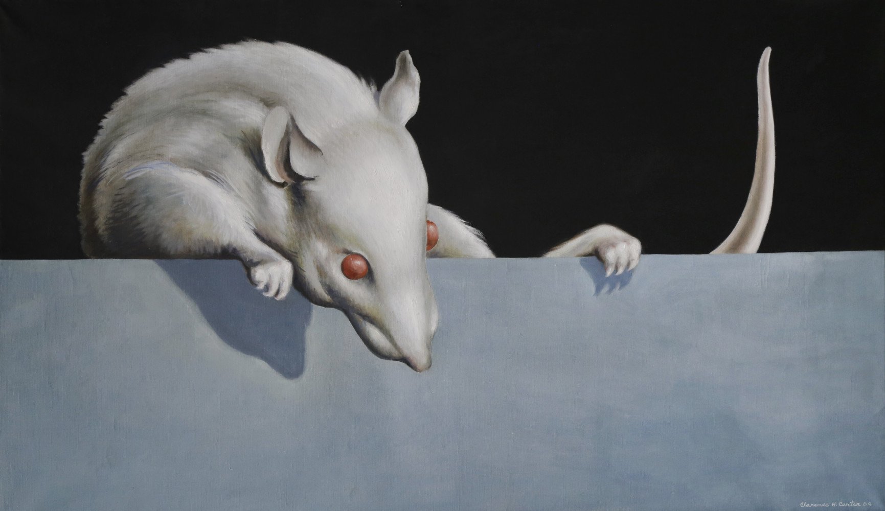 Glowing ovoid shapes hover over desolate, dream-like landscapes in some paintings. In another, a green-skinned vision of Tennyson’s Lady of Shalott lies supine on a watery bed, glowing in phosphorescence. A white rat with red eyes seems distressingly poised to climb over a blue monochromatic wall and into the viewer’s space in yet another painting.